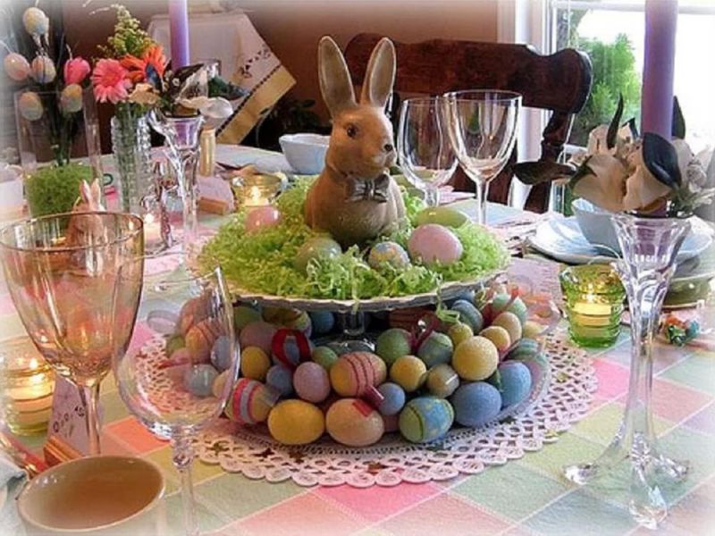 Яйца: яйца могут быть из дерева, перьев, и тд., их также можно по-разному украшать. Даже яичная скорлупа может служить отличным декором: в нее можно поставить свечи, или подвесить скорлупки к центральному букету и положить в них маленькие угощения.