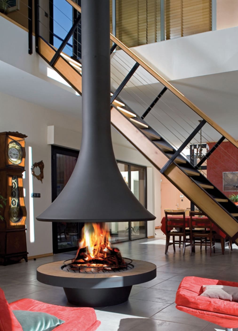 центральные камины могут быть двух типов: напольные и подвесные. В первом случае, камин находится на полу, в центре помещения, а дымоходная труба крепится к потолку. Во – втором, камин соединен с подвешенным дымоходом и становится практически трансцендентным объектом, свежим и, на удивление, оригинальным. Корпус центрального камина может быть пирамидальным, шарообразным, кубическим и, как правило, закрытым одним или несколькими стеклокерамическими окнами, позволяющими видеть языки пламени с любой стороны. Исключение составляют островные камины с открытой топочной зоной, например, от известной французской компании FOCUS, которая предлагает отдельные каминные серии без термостекла, имеющие сравнительно небольшую тепловую эффективность (59%): GIROFOCUS, DOMOFOCUS или BATHYSCAFOCUS.