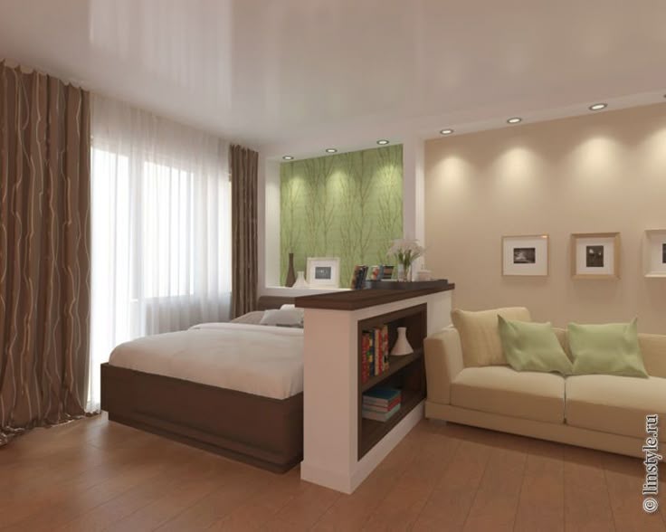 Существует несколько вариантов расстановки мебели для такого зонирования. Одним из них является использование откидной кровати, которая днем складывается в шкаф.