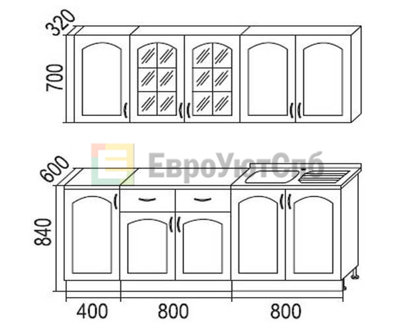 Ширина верхнего шкафа может варьироваться в зависимости от основного шкафа или других особенностей кухни, например размещение окон, плит, холодильников, кладовых и др.