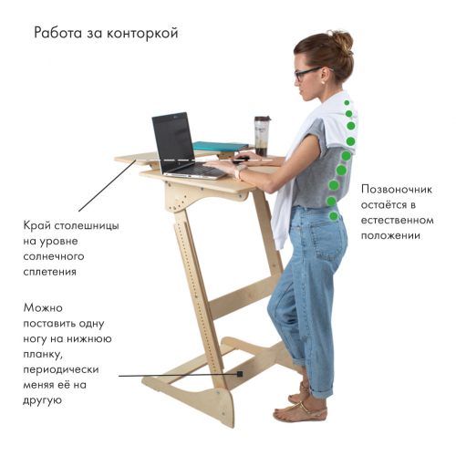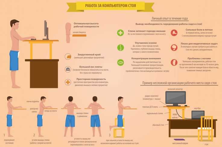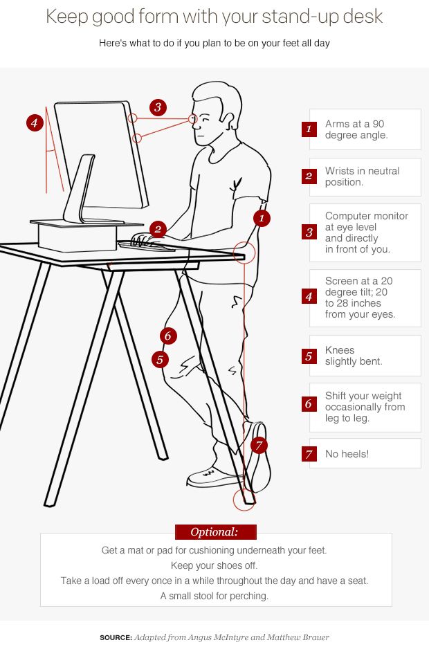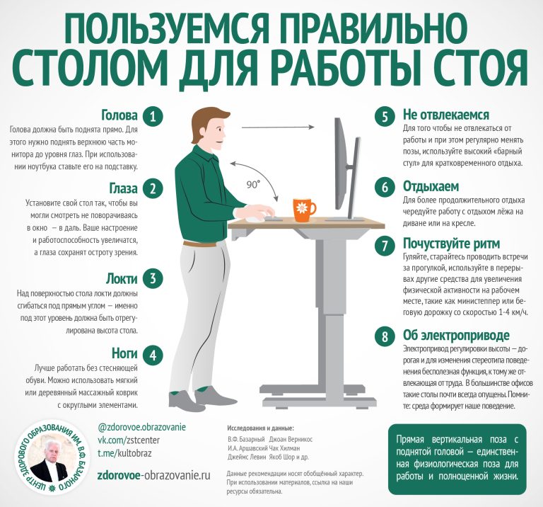 Правильная высота стола для стоя снижает нагрузку на глаза и устраняет необходимость компенсировать это движениями головы. Со временем это изменение в вашей голове имеет серьезные пагубные последствия для вашей шеи. Лучше быть ниже, чем выше.