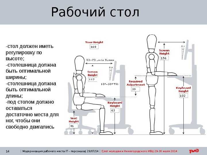 - Убедитесь, что ваши глаза находятся на уровне верхней трети монитора, а затем при необходимости отрегулируйте высоту стола.
