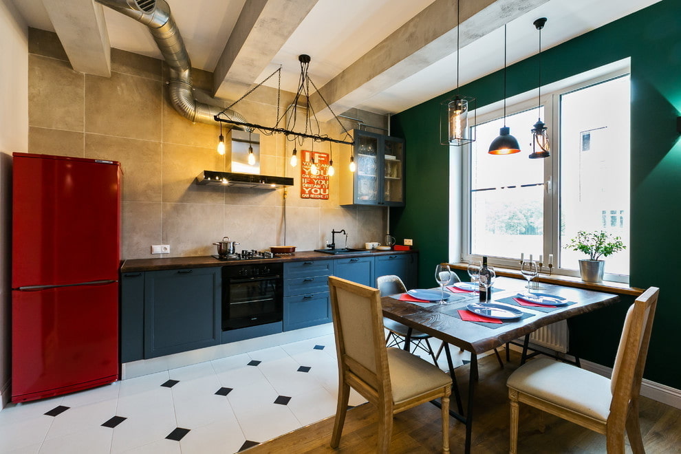 Одну стену в комнате полностью занимает гарнитур и так, как для холодильника не остается места, его устанавливают на параллельной стороне вместе с обеденным столом и стульями.