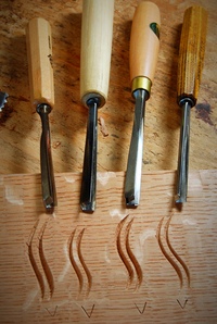 - Глубокие пазы удобно выбирать стамесками с изогнутым лезвием – так называемыми клюкарзами. При этом нужно стараться, чтобы режущая кромка не погружалась ниже выбранного уровня.