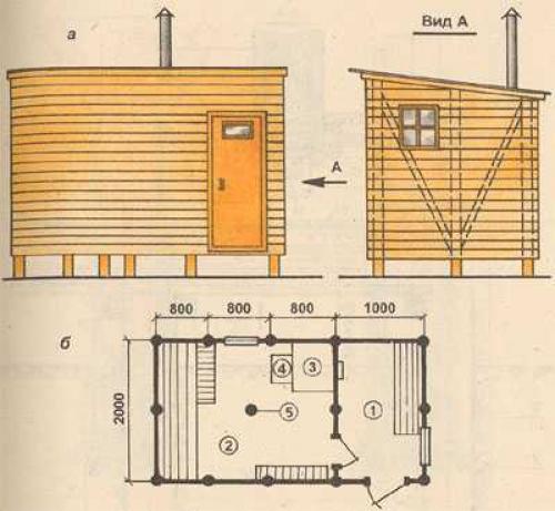 Она отличается минимумом помещений: хватит парилки и предбанника, отсутствием водоснабжения (не бояре, принесем воду и вручную, ведрами). Зато возводится быстро и на нее не надо много материала, а значит и затрат будет меньше.