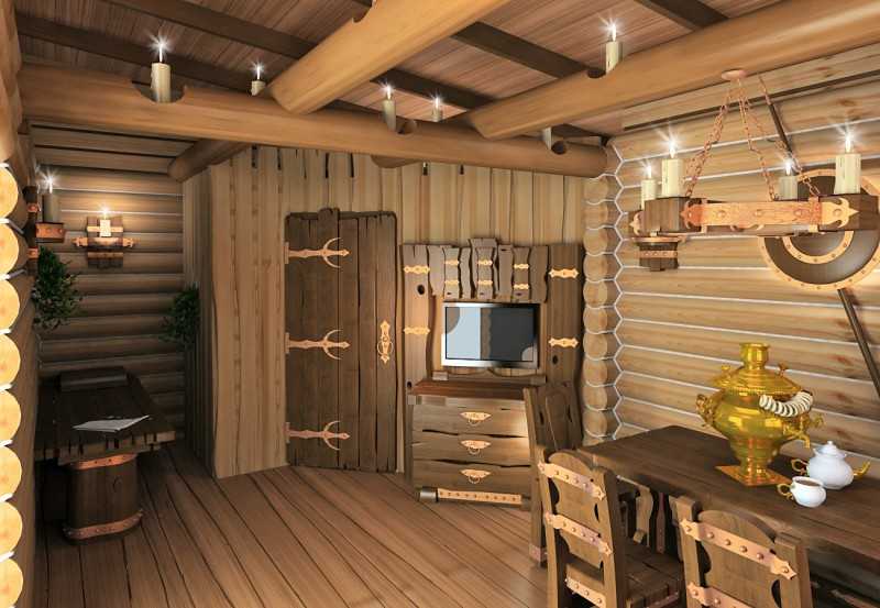 Интерьер парилки в русском стиле будет выглядеть законченным, если дополнить его декоративными аксессуарами. Помещение можно оформлять банными вениками, вышитыми занавесками, изделиями из дерева – статуэтками, ложками, зеркалами, часами из древесных спилов, которые не боятся влажности и помогут выделять достаточно времени для важных процедур.