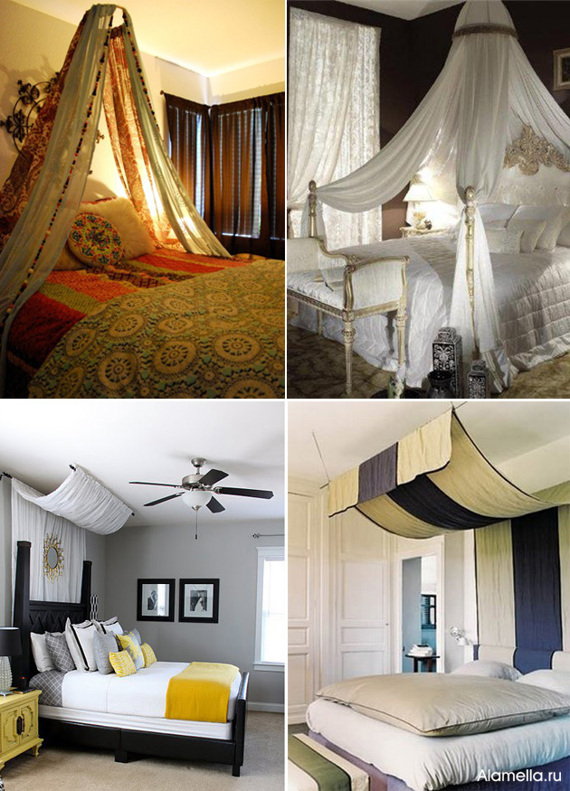 Еще одной особенностью тканевых накидных полотен над кроватью является их способность зрительно уменьшать пространство, «опуская» потолок. Для маленьких комнат это станет, конечно, минусом, а для больших может послужить удачным способом сделать пустующее помещение более уютным.