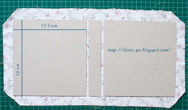 Куски для передней и задней частей обложки отрезаем, отступая 2-3 см от краёв картонных заготовок.