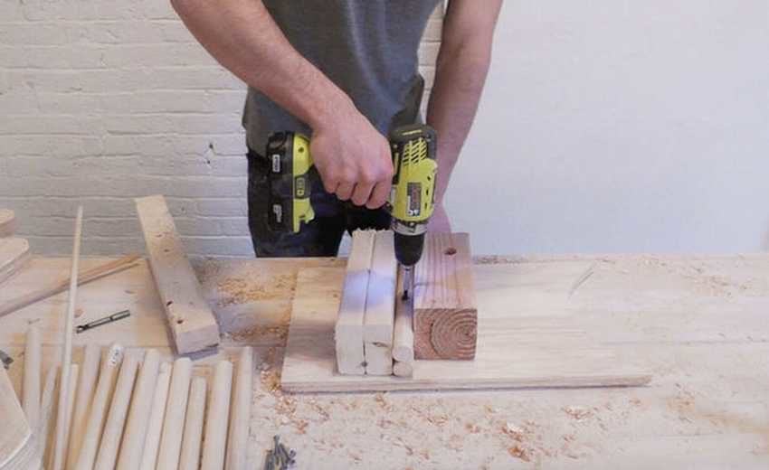Подготовленные бруски нужной длины скрепляются между собой с помощью шкантов или саморезов. Шканты можно изготовить самостоятельно, вырезав из дерева цилиндрические детали размером 10 на 20 на 50 мм. В брусках высверливаются пазы по размеру шкантов и две детали плотно скрепляются между собой на таких небольших элементах с добавлением обычного клея ПВА.