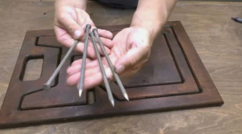 - В деревянных планках, отступая на 2,5 см от краев, просверлите 8,5 шпилек отверстия диаметром 20 мм (в них должен быть свернутый вдвое шнур диаметром 8 мм).