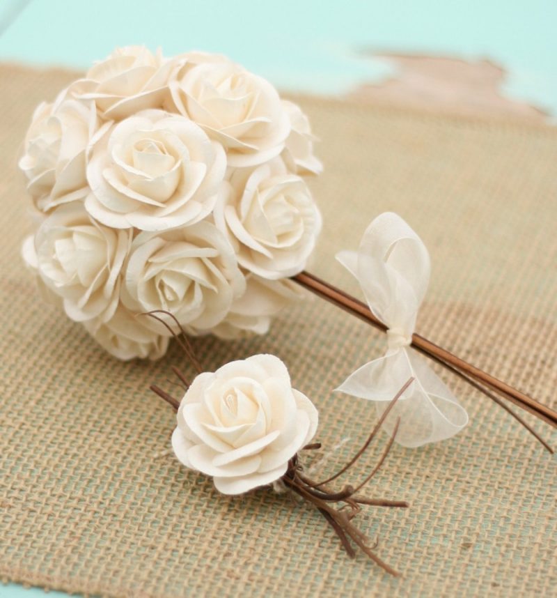 Букет цветов украшают гипсофилой. Сделать цветок из туалетной бумаги, особенно гипсофилу, очень просто. Возьмите белую туалетную бумагу. Сложите ее в тугой рулон и прижмите его по краям, придайте ей форму ножницами. Сделайте таких небольших бутончиков большое множество. После зафиксируйте их клеем на стебле. Стебель делайте из тонкой проволоки, которую по окончанию обмотайте бумагой зеленого цвета. Для цветоложе возьмите бархатную бумагу.
