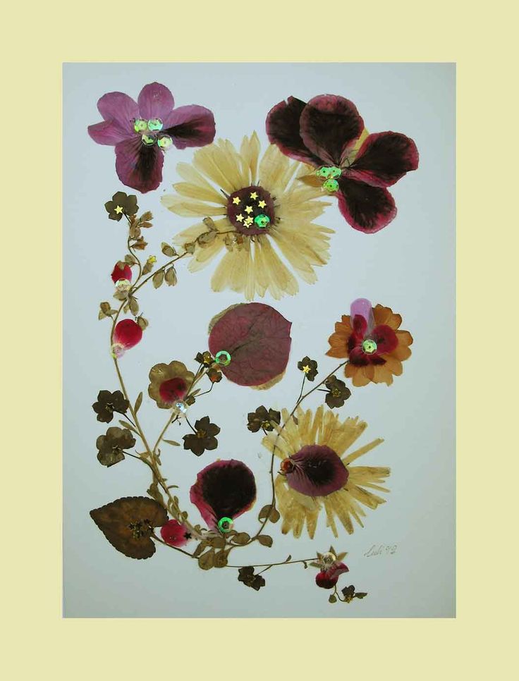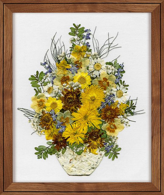Для таких картин цветы сушат БЕЗ ПРЕССА… подвешивают в сухом помещениеи головками вниз… или укладывают бутоны в коробки с манной крупой (и сушат на солнце не закрывая коробке).