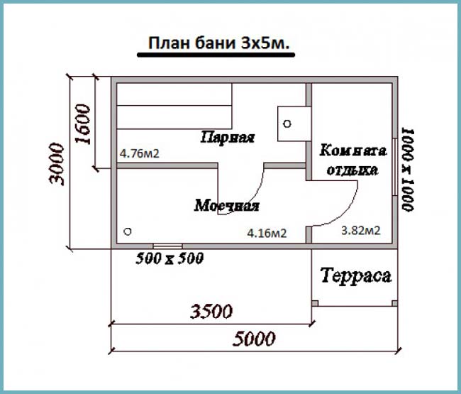 - 3 м×3 м. Такой вариант можно распланировать по-разному. Если есть желание, чтобы в парилке помещалось три человека, тогда ее можно сделать размером 3 м×1,50 м, моечную можно сделать отдельной, поставив там душевую к