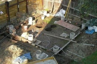 Разметка и подготовка строительной площадки. Выкорчевываются возможные корни деревьев, участок очищается от строительного мусора. Далее вбивается строго вертикально первый кол (так отмечается угол бани).