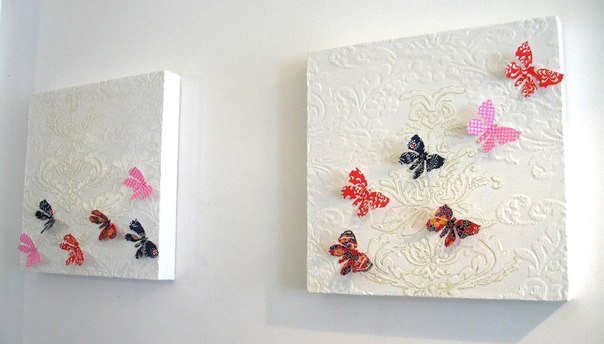 Бумажные изделия легко крепятся к стенке в любом положении. Крылышки поделок красиво трепещутся под воздействием потоков воздуха. Если украшения надоели, их можно легко снять не сожаления потраченного времени и денег. - Картонные поделки более прочные, им легко придать любую форму. Смочив картонный элемент, поместите его под пресс и получите интересный изгиб крылышек. С помощью данного варианта изготовления декора можно гармонично украсить комнату насекомыми со слегка приподнятыми крыльями.
