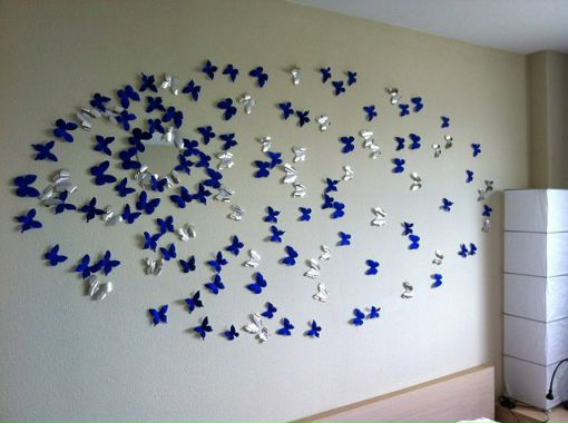 Для украшения стен в помещении можно использовать бумажные, картонные, тканевые, жестяные бабочки. Часто декорируют обоями, фигурками, выполненными техникой оригами. Поделки могут быть плоскими, объемными, однотонными, разноцветными. Для создания красивого изображения нужно подобрать хороший трафарет.