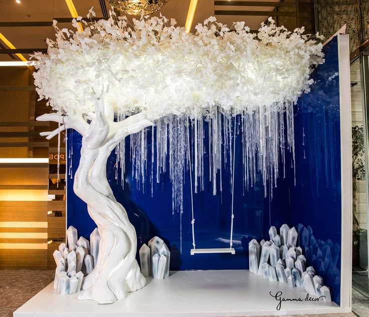 В нем можно поставить настоящую (но лучше все же искусственную, чтобы клининговому отделу не приходилось каждый день собирать опавшие иголки) елку. Хорошо будет смотреться подвесной декор на потолке: шары, звезды, бумажные гирлянды или украшения из фольги на лентах или нитках разной длины.