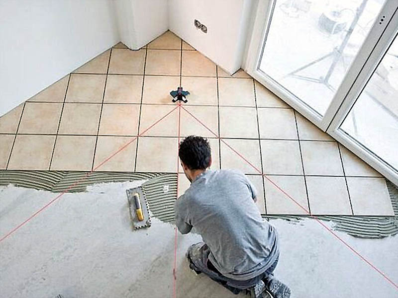 Рис.3. С точки зрения порядка укладки напольной плитки диагональная укладка ничем не отличается от прямой укладки. Для повышения точности диагональной укладки можно использовать специальный лазерный уровень с тремя лучами.