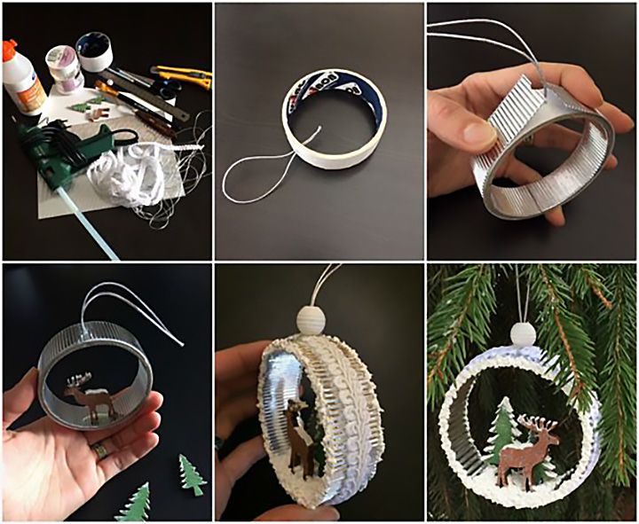 Сначала собирают зимнюю композицию на кружке из картона. Для нее можно использовать подходящие по тематике маленькие игрушки от киндер-сюрприза и искусственный снег. Готовую основу накрыть сверху пластиковым стаканом, хорошо его приклеив. Если сверху стаканчика сделать петельку, то его можно будет повесить на елку.