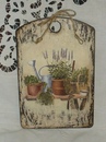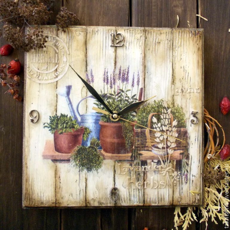 Никакого золота и драгоценных металлов в декоре не используется. Чаще всего в работах используются изображения лаванды и трав, которые мы часто применяем на кухне, в качестве специй,- тимьян, розмарин, душица или орегано, базилик, тмин. Обычно деревенский стиль подразумевает в себе налет времени, поэтому на работах будут уместны потертости, протравливания, кракелюры и патинирование, но это совсем не обязательно.