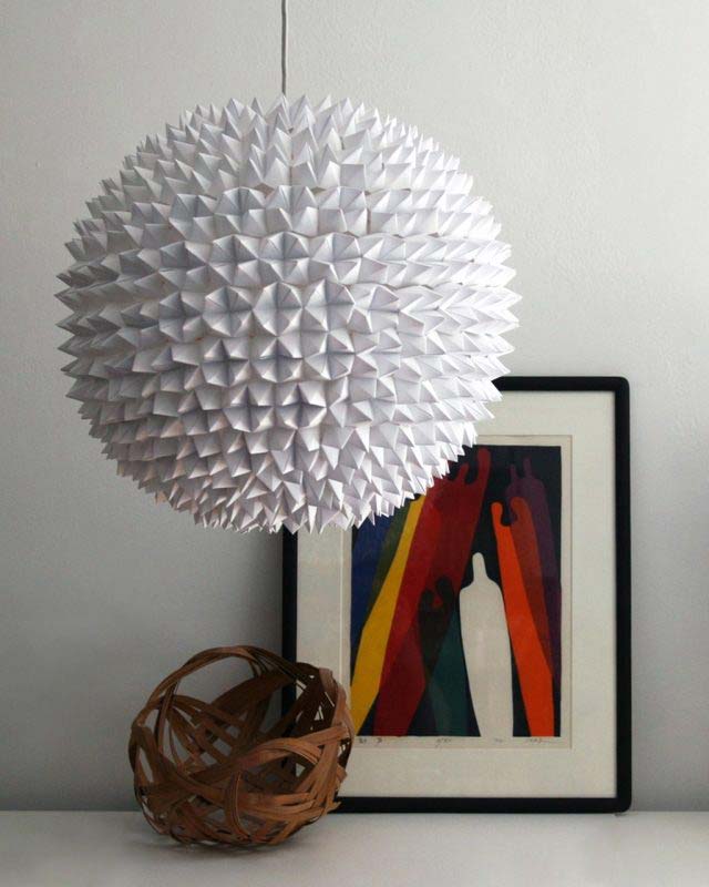 Эта люстра очень аккуратного дизайна. Вы создаете это вроде как делаете папье-маше. Вы надуваете воздушный шар и раскладываете на нем салфетки.