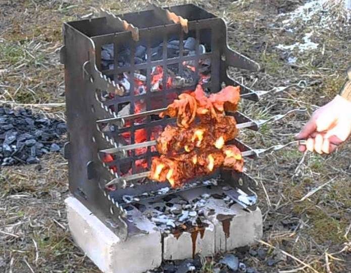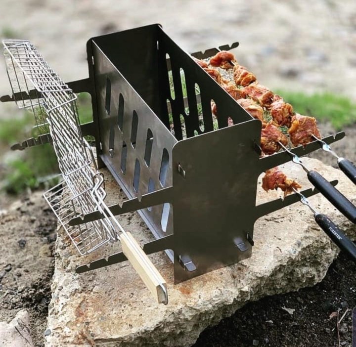 Иногда шашлычницу снабжают узлами, в которые крепят небольшие подставки, столики, решетку для барбекюЕсли главное блюдо, которое будете готовить – шашлык, размещение шампуров делают более удобным.