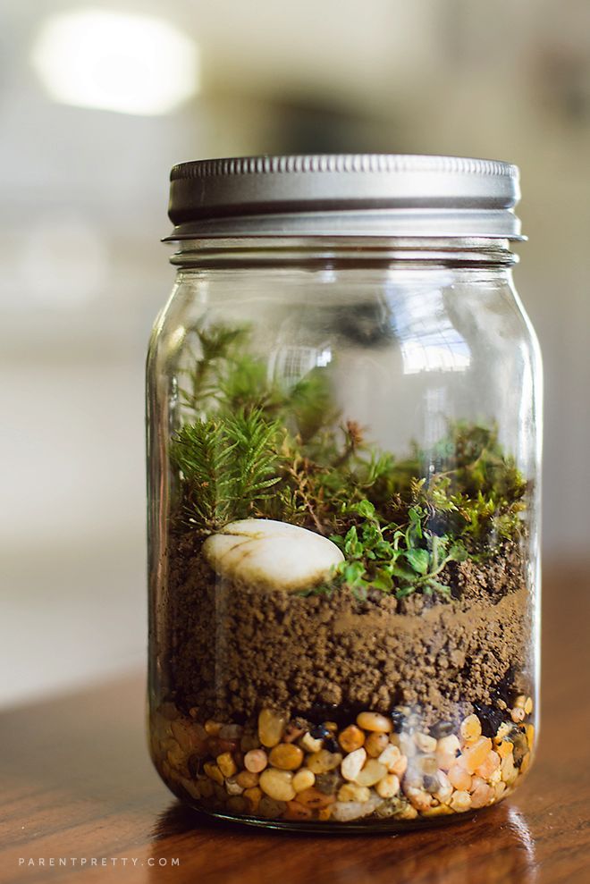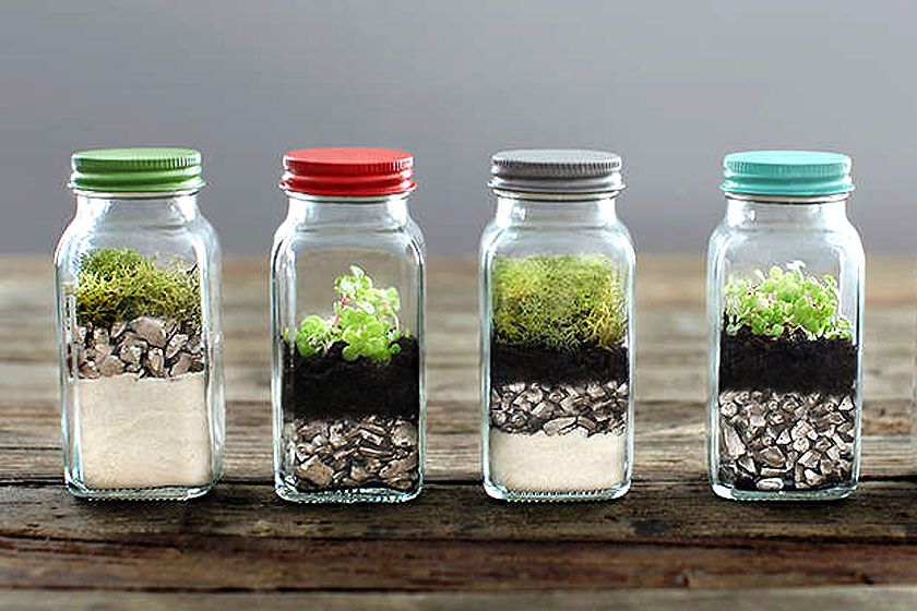 Используйте ту же формулу слоев для создания террариумов своими руками из любого подходящего контейнера. У нас был один из старого стоячего автомата с жевательной резинкой, который я обожал (а потом мои дети посадили в него гусеницу, и эта чертова гусеница съела все — дополнительное примечание, не добавляйте жуков в свой террариум!).