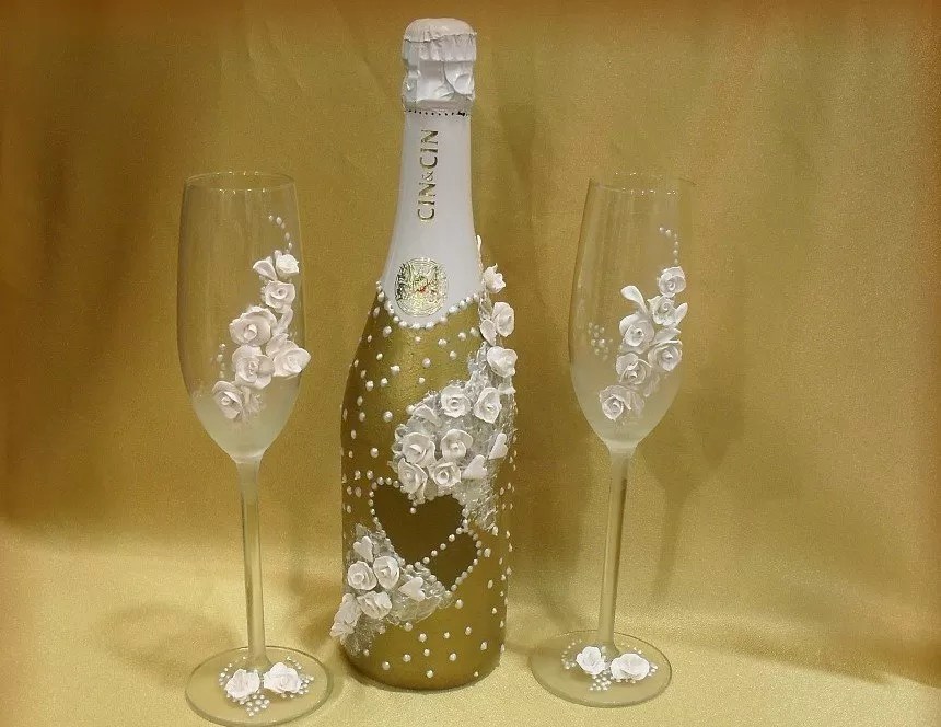 Оформление рекомендуется проводить различными методами. Но все, конечно же, зависит от стилистики праздничного мероприятия и вкуса молодоженов. Существует множество разнообразных видов декорирования свадебных бутылок: