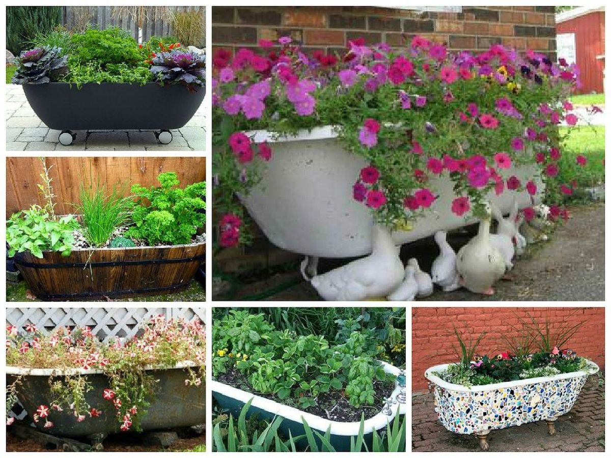 - для обустройства большой клумбы возможно использование такого подручного материала: ящиков от мебели, корыт, тазов, старых ванн, тележек – из чугунной ванны на даче можно оборудовать оригинальный водоем;