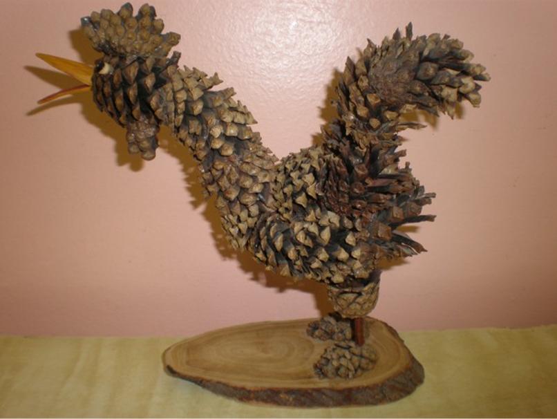 Сначала надо взять пластилин желтого цвета, из которого делается головка. Теперь нужно сделать подставку для поделки . Из пластилина также лепят крылья, глазки и клюв. Все полученные формы просто надо прикрепить к шишке и установить объемную поделку на подставку. Также можно сделать хвост из перьев, предварительно окрасив его цветными красками, так получится павлин.