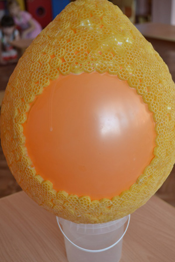 - Когда весь шар будет обклеен макаронами, его нужно оставить в покое для того, чтобы он высох.