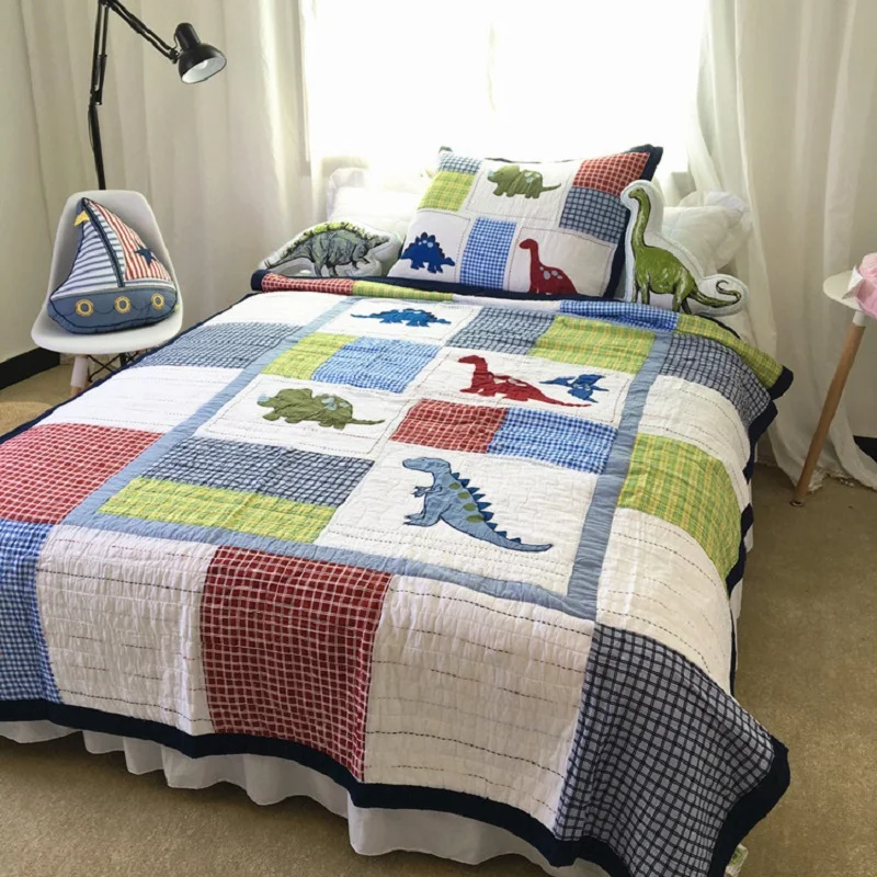 Покрывало для детской кровати должно быть ярким и функциональным. Сатин, жаккард, бархат и гобелен не подойдут — они быстро придут в негодность. Если ребенок младше года, выбирайте мягкие теплые ткани, которые не раздражают кожу. Отличный вариант — флис. Яркие рисунки на материале сведут работу по пошиву покрывала своими руками к минимуму — достаточно будет отрезать полотно нужного размера и подогнуть или обметать края.