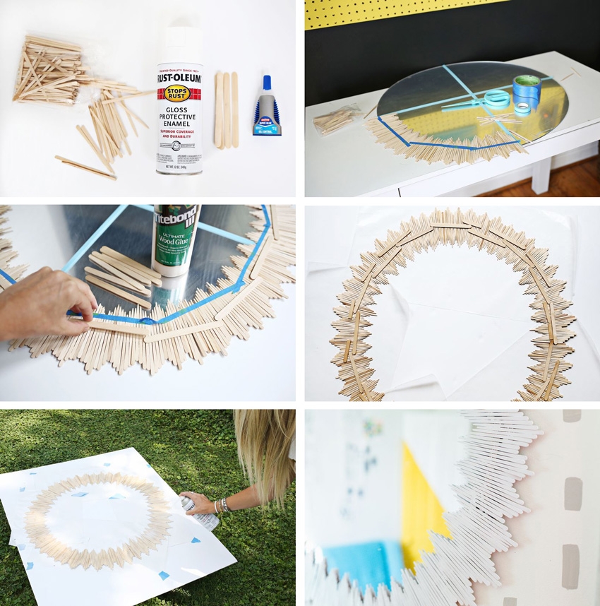 Даже если это ваш первый самодельный проект по дереву – вы справитесь (ну… на самом деле, склеите). Вот простой обзор: измерьте зеркало, возьмите детали для лепки, половинки деревянных шаров, вырежьте древесину, склейте все части вместе, покрасьте и, наконец, приклейте древесину к зеркалу. И вы сделали!