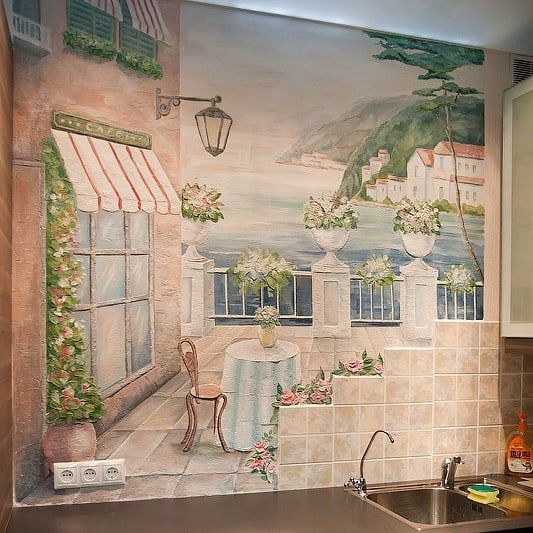 Красивые рисунки на стенах на кухне утром приветствуют нас вместе с чашечкой любимого кофе, а вечером дарят приятный комфорт во время семейного ужина. Удачная стильная роспись кухонных стен – еще и решающий акцент во всем интерьере, который можно обновить или заменить в любой момент.