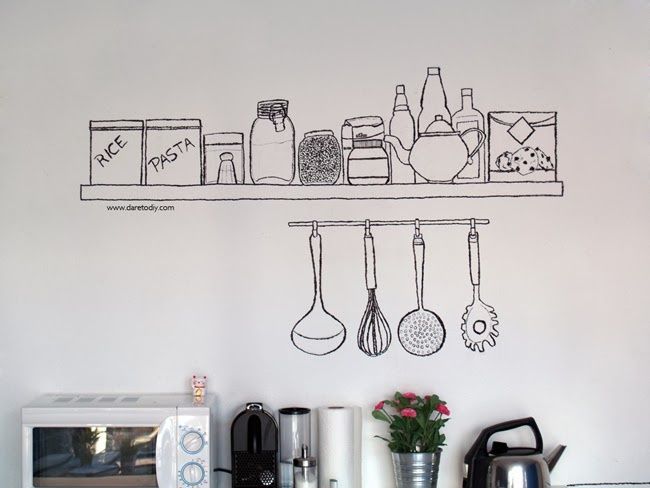 Нарисовать в кухне на стене таким способом можно все что угодно. Трафареты любого размера и формы можно скачать с интернета и распечатать на принтере.