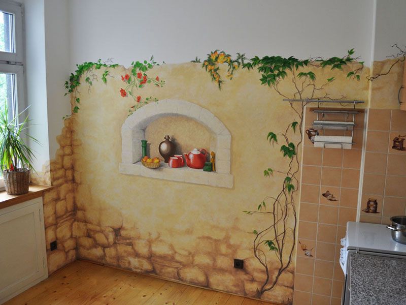 В некоторых случаях наносят рисунок на кухне во всю стену. Для этого необходим опыт. Новичкам лучше подбирать несложные композиции среднего размера.