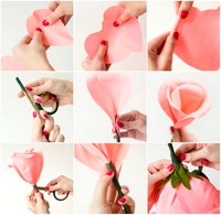 Затем добавляют наружные лепестки. Их фиксируют клеем, используя термопистолет. Еще один вариант – делать лепестки с длинным кончиком. Такие розы крепят на проволочный каркас. Кончики скручивают, около хвостика формируют чашелистик, затем стебель – обматывают проволоку бумагой.