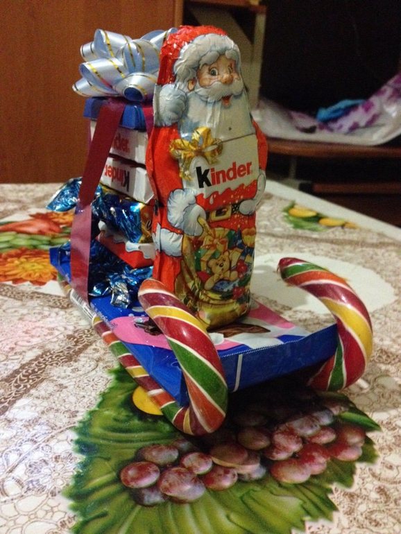 Сладости на Новый Год или Рождество – это уже традиционный подарок для детей, но преподнести его можно интересно и оригинально. В настоящее время на полках магазинов можно найти множество разных конфет, из которых можно сделать композицию, например, в виде саней Деда Мороза: леденцы – трости используем в качестве полозьев, длинные шоколадки в качестве основы, а маленькими конфетками наполняем сани.