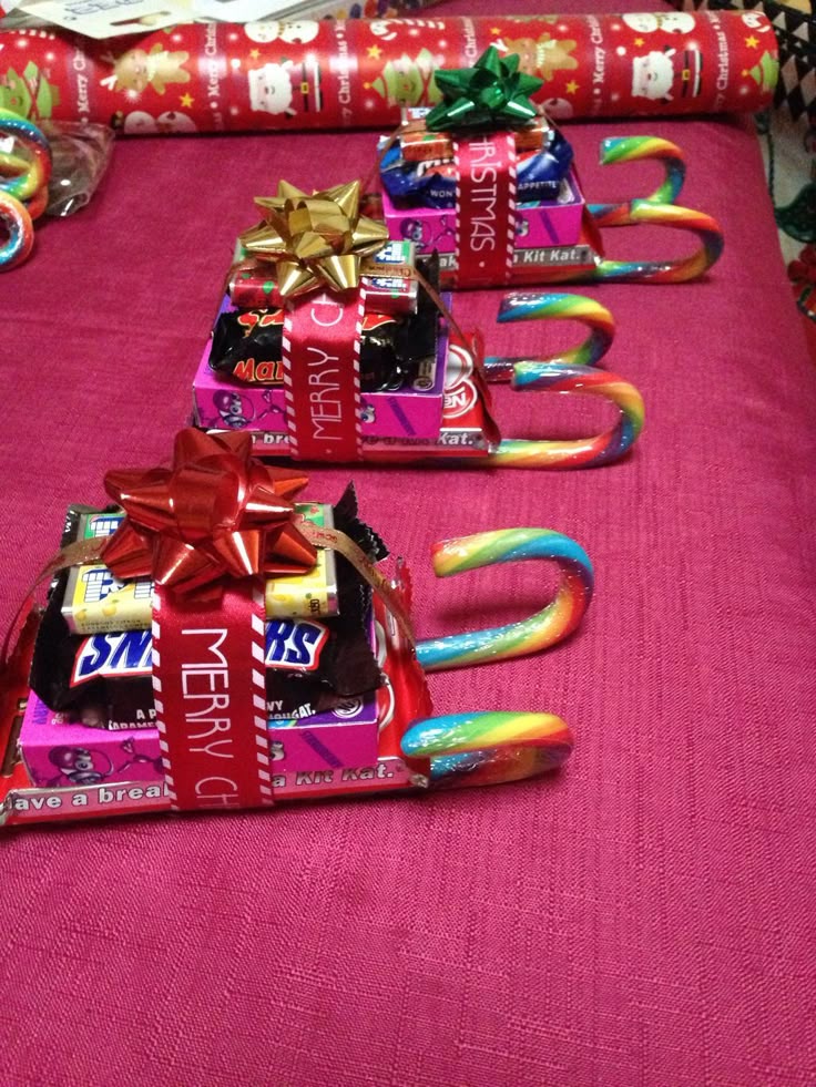 Пользуются популярностью новогодние подарки из конфет, шоколада, мармелада и других сладостей, оформленные необычным способом. Например, вы можете с помощью скотча и лент сделать новогодние сани.
