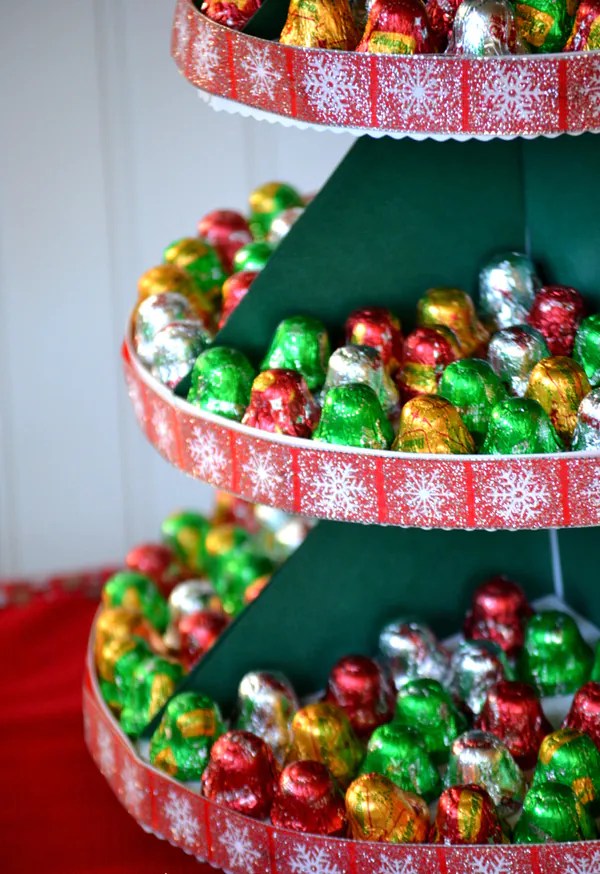 Между сладкими рядами для дополнительного украшения рекомендуется смонтировать гирлянду, «дождик» или любую другую праздничную мишуру.