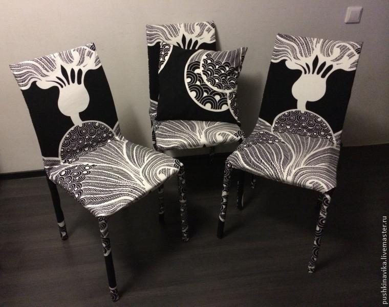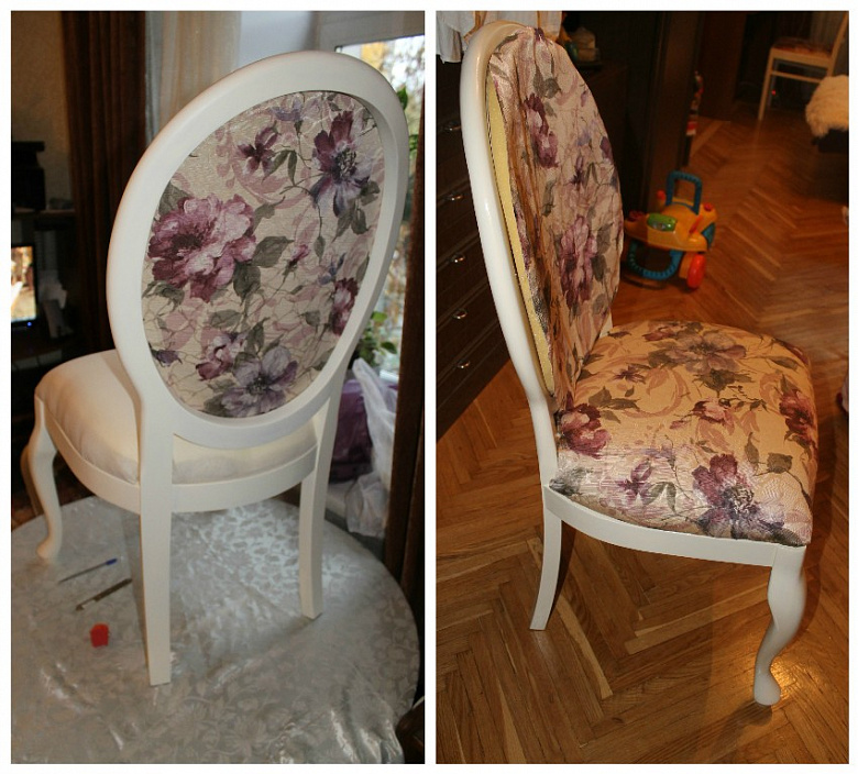 Для пластиковых стульев покраска нежелательна, так как гибкость материала будет провоцировать отслоение краски, на них лучше сшить чехлы или подушки из подходящей ткани.Наконец, на последнем этапе нужно обновить обивку мягких частей стула. После того, как снята старая обивка, вырезается поролон нужной толщины по форме основы сиденья, его можно закрепить с помощью клея. Выкраивается ткань с учетом припуска на подгибку вокруг поролона с фанерой.