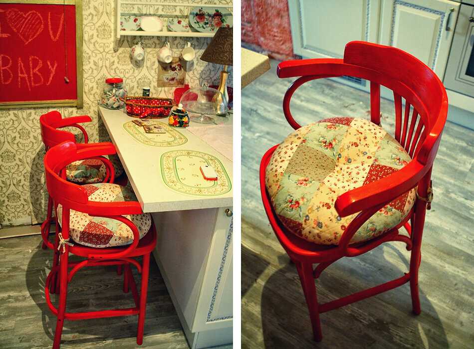 Для придания национального колорита хорошо зарекомендовала себя техника пэчворк.В этом случае приобретаются подходящие по дизайну отрезы ткани, а лучше утилизировать отслуживщие свое предметы одежды. Ткани нарезаются на лоскуты и комбинируются так, чтобы узор не сливался, и обклеивают ими ножки и сиденье табурета. Сверху все покрывается лаком.Выбирая дизайн стула, стоит воспользоваться всей палитрой своего воображения или присмотреться к уже существующим образцам в художественных каталогах.Яркая драпировка из старых стульев сделала очень стильные и роскошные стулья в стиле бохо.Кухонная обеденная група заиграет новыми яркими красками после смелой реставрации старых стульевНежные мятные и бежевые тона подходят для интерьеров шебби-шик, тем более что основа действительно состарена временем.О том, как реставрировать стул своими руками, смотрите в следующем видео.