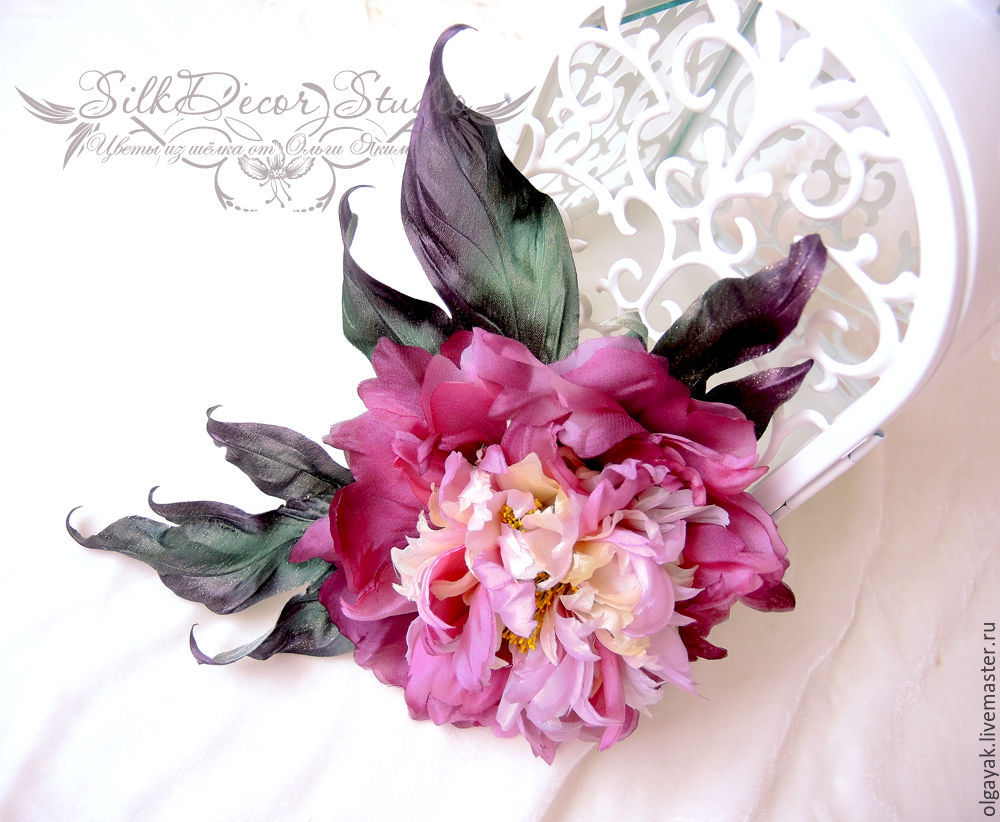 Выбранные материалы: натуральный шёлк (туаль) — для лепестков и шёлковый атлас — для листьев.