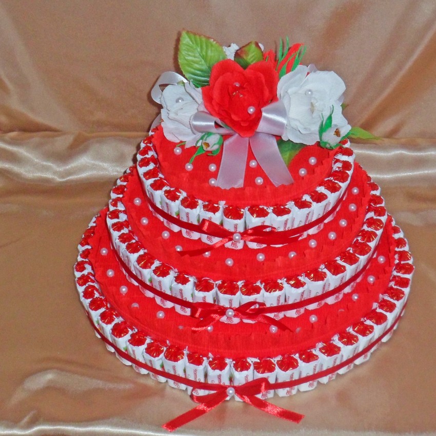 В конце праздника на стол подают торт. Зная, как делаются цветочные заготовки, вы можете легко «испечь» кондитерское изделие из салфеток своими руками. Бумажный торт может выступать как в качестве упаковки, под которой скрывается настоящий десерт, так и в роли шуточного презента.