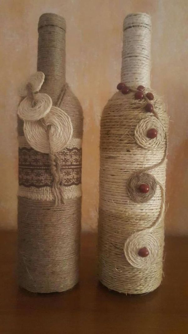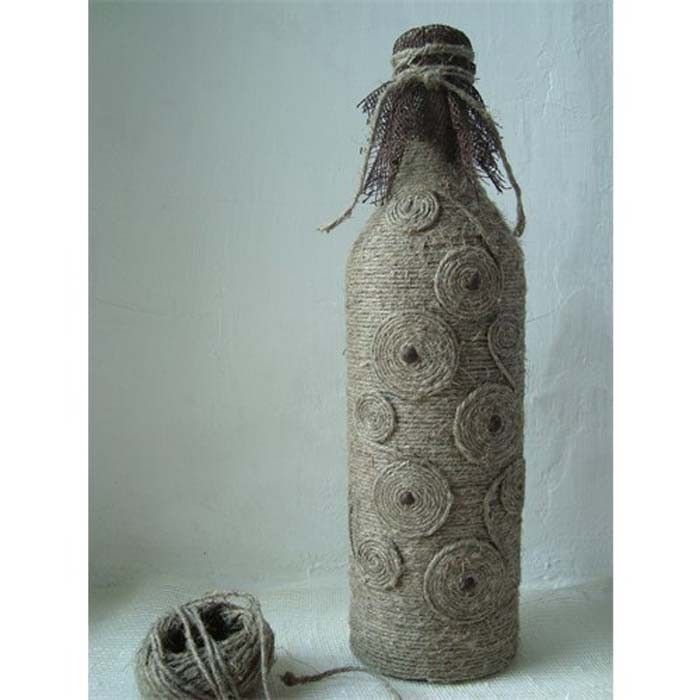 Конечно, — это все шутки. Оформленная обычными джутовыми нитями емкость под алкогольные напитки, не может быть шедевром. Но украшенная таким образом бутылка отлично впишется практически в любой интерьер, привнесет нечто особенное в праздничный стол и сделает домашнее вино, налитое в неё, более привлекательным и благородным. А может стать частью подарка. Итак, начнем.