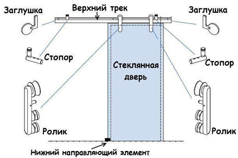 - Ролики, установленные в направляющей, прикрепленной к стене. Длина направляющей составляет примерно две ширины двери.